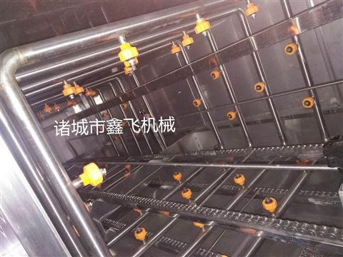 周轉筐清洗機設有氣泡發生裝置,利用氣泡的上下翻滾將蔬菜上殘留的泥沙和殘留農藥等雜質清洗干凈,并配有網帶輸送裝置可以將被清洗的蔬菜不斷向前推進,在出水面的時候會有噴淋裝置對蔬菜進行高壓沖洗進一步把蔬菜上的殘留雜質清洗一遍,在蔬菜清洗機的末端裝置一個風機可以將蔬菜表面的水分吹掉一部分,更方便了下一步的加工。
